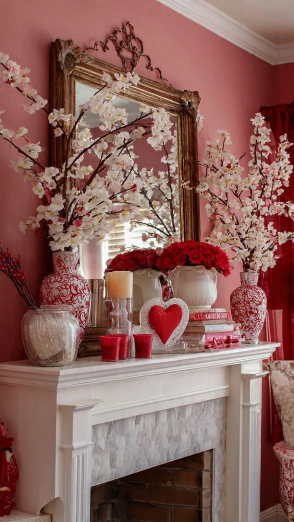 A mirror can instantly elevate mantel decor by reflecting light and making the space feel larger and brighter. Choosing a mirror with an ornate or vintage frame adds sophistication and visual interest. Surrounding it with heart accents, fairy lights, or soft decorative elements enhances the Valentine’s theme. Light fabrics or delicate draping can add a dreamy touch without overwhelming the design. As a centerpiece, a mirror helps anchor the Sensational Valentine’s Day mantel and draws attention to the surrounding decor.