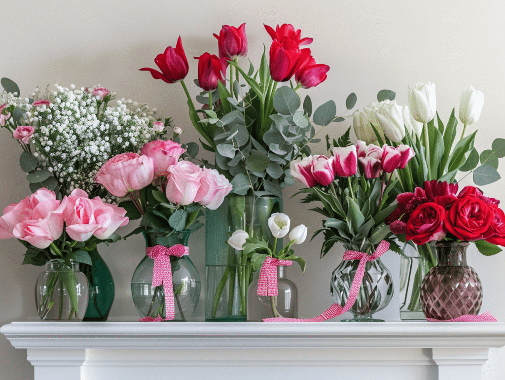 Fresh flowers are a timeless part of Valentine’s Day decorating and bring life and color to any mantel. Arranging roses, tulips, or carnations in shades of pink, red, and white creates a coordinated and romantic look. Adding greenery such as eucalyptus or baby’s breath softens the arrangement and adds natural texture. Decorative vases or ribbon-tied jars elevate the presentation, making it feel polished and intentional. The mix of fresh scents and vibrant colors instantly brightens the room, making floral displays a key element of Sensational Valentine’s Day decor.