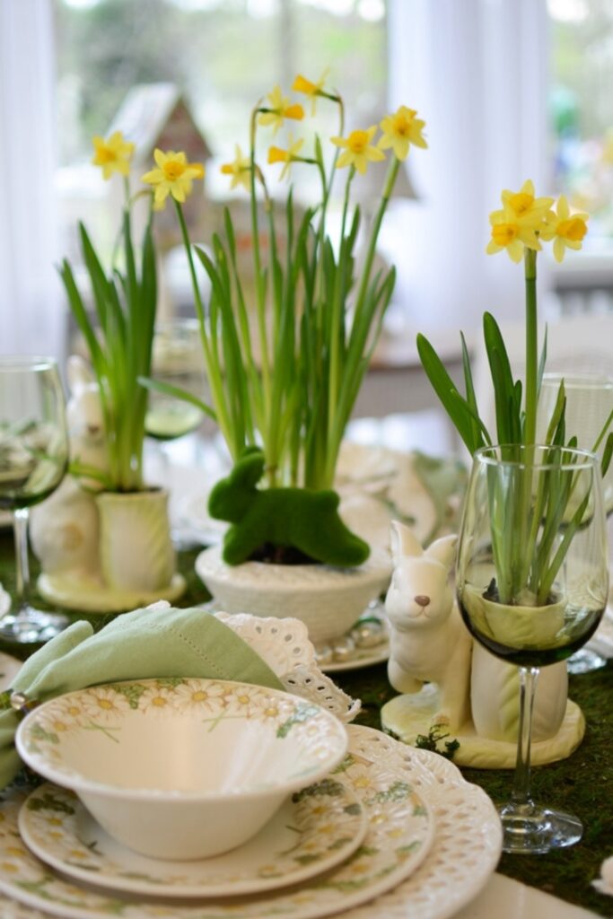 This centerpiece feels fresh and different. Growing grass as a base adds texture that most setups miss.