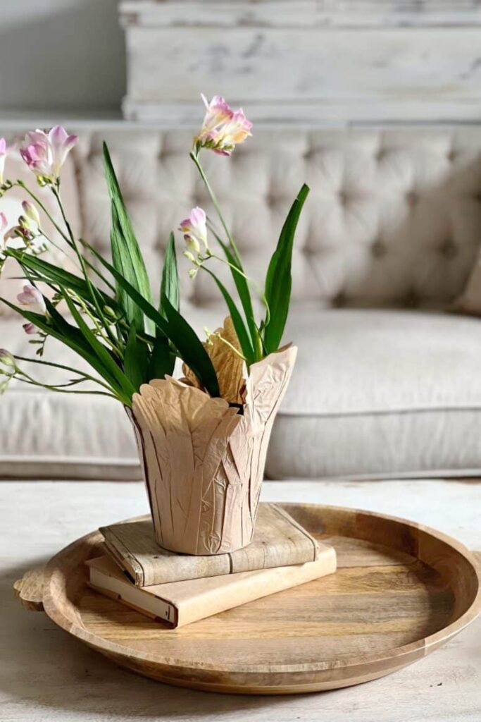 I like tiered trays because they add height without taking too much space. Sunflowers bring a warm and cheerful feel.