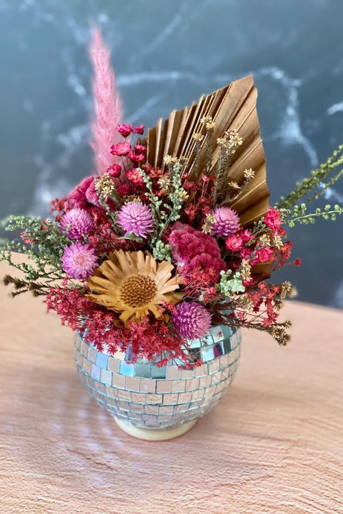This is a fun mix of natural and modern styles. Adding disco balls creates a reflective effect that stands out.