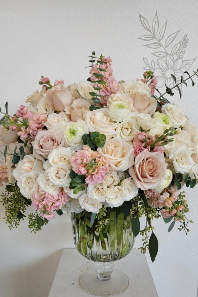 I like using a tall glass bowl because it adds height without blocking conversation. Mixing flowers like ranunculus and hyacinths creates a layered look that feels full and vibrant.
