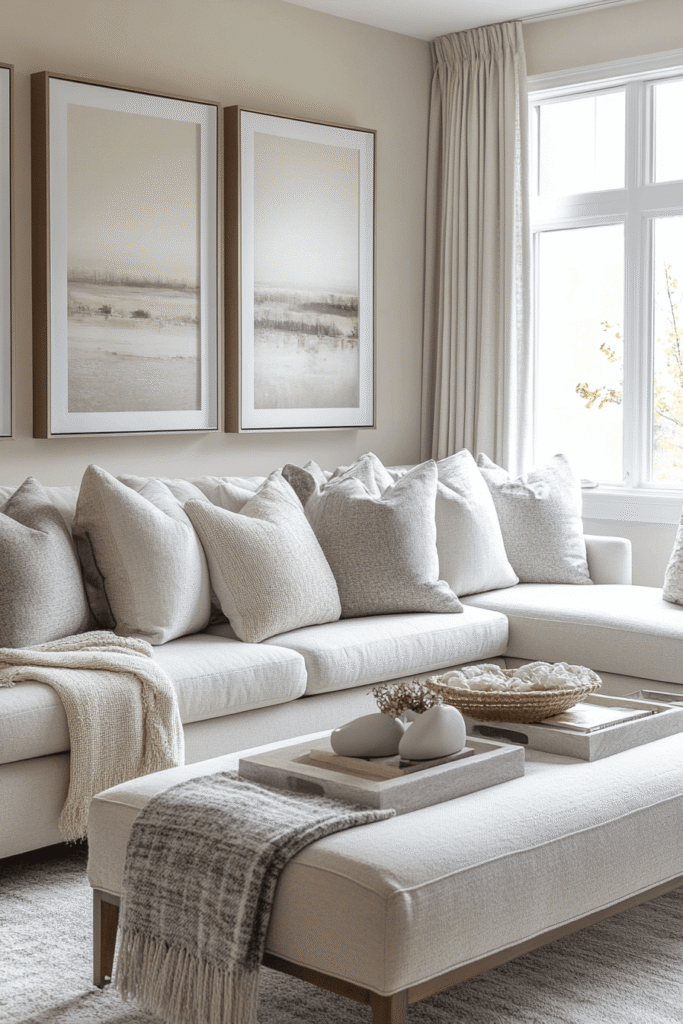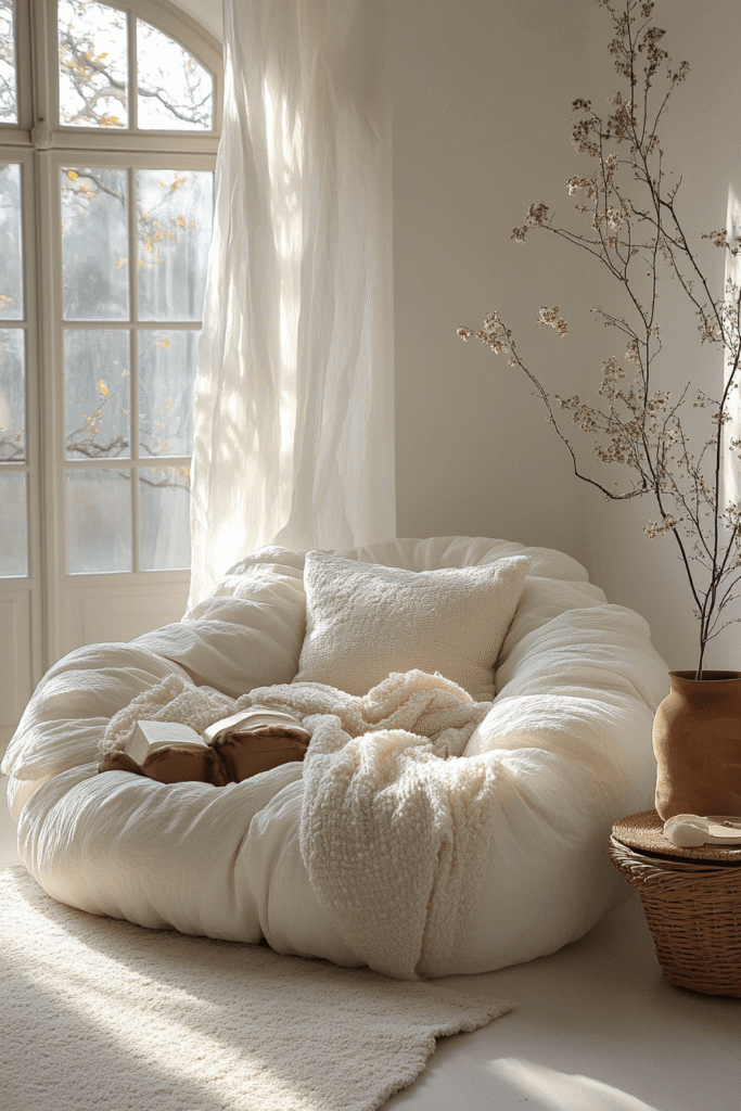 This space reflects aesthetic home decor through soft layers, gentle fabrics, and light tones that create a calm atmosphere. Rounded furniture and plush cushions make the room feel relaxed and welcoming. The lack of strong contrast keeps the look smooth and soothing. Natural light plays a key role in keeping the space open and airy.