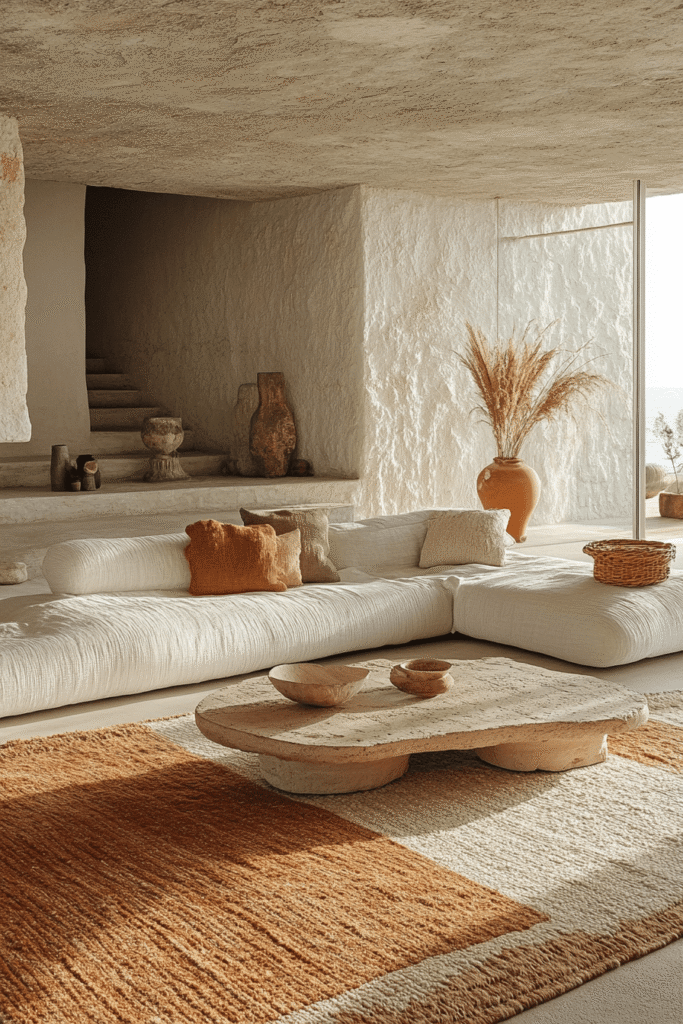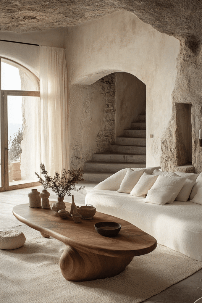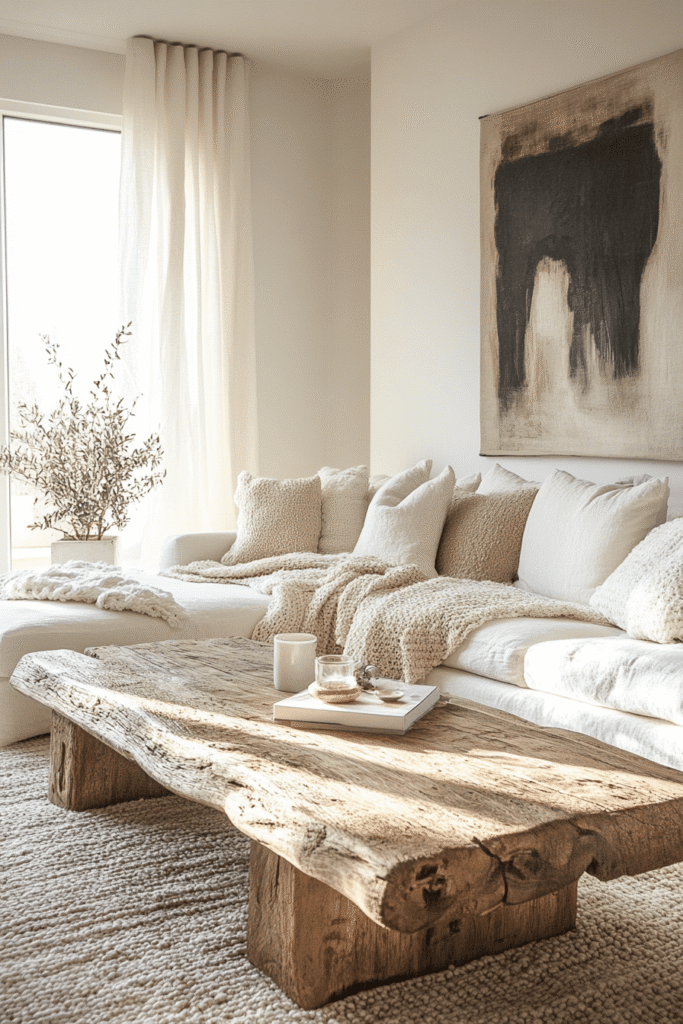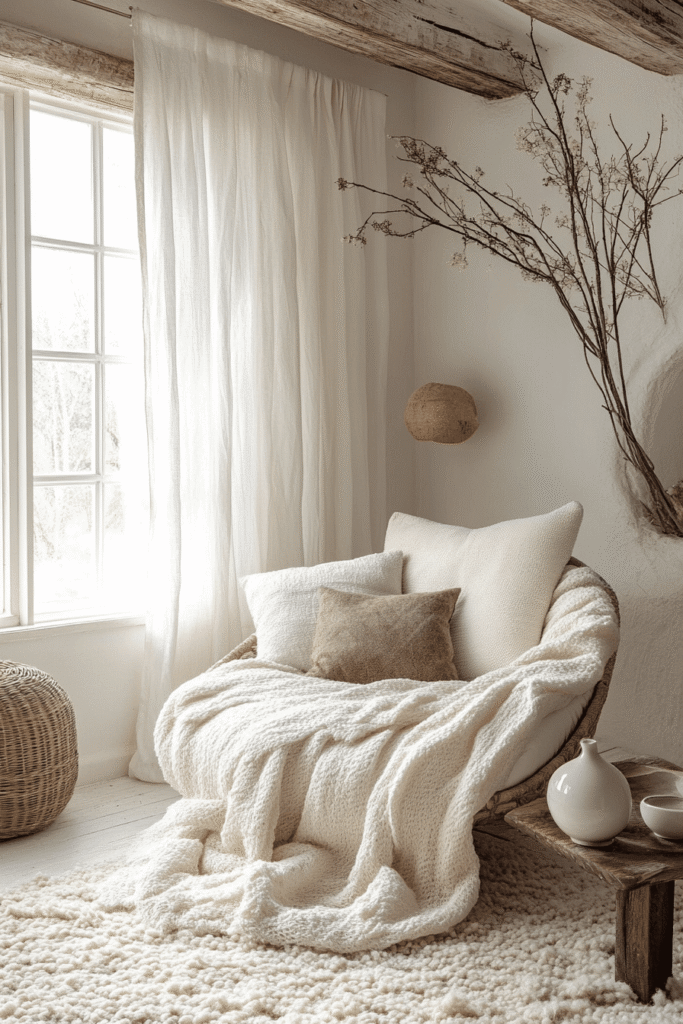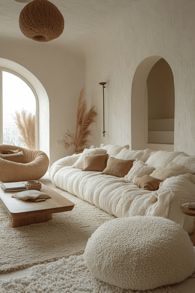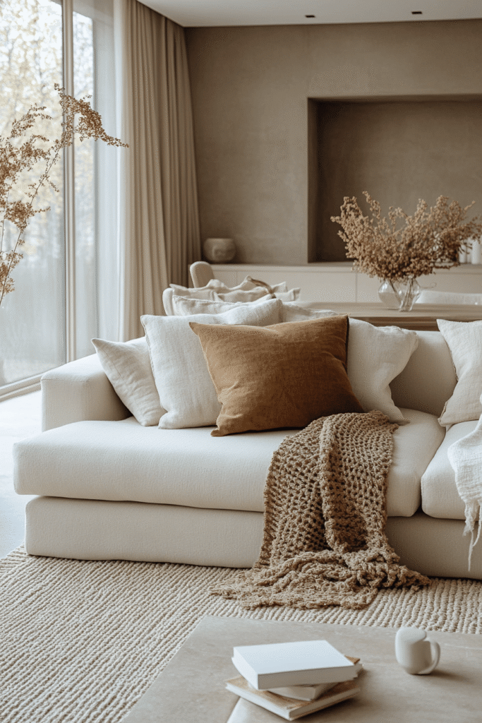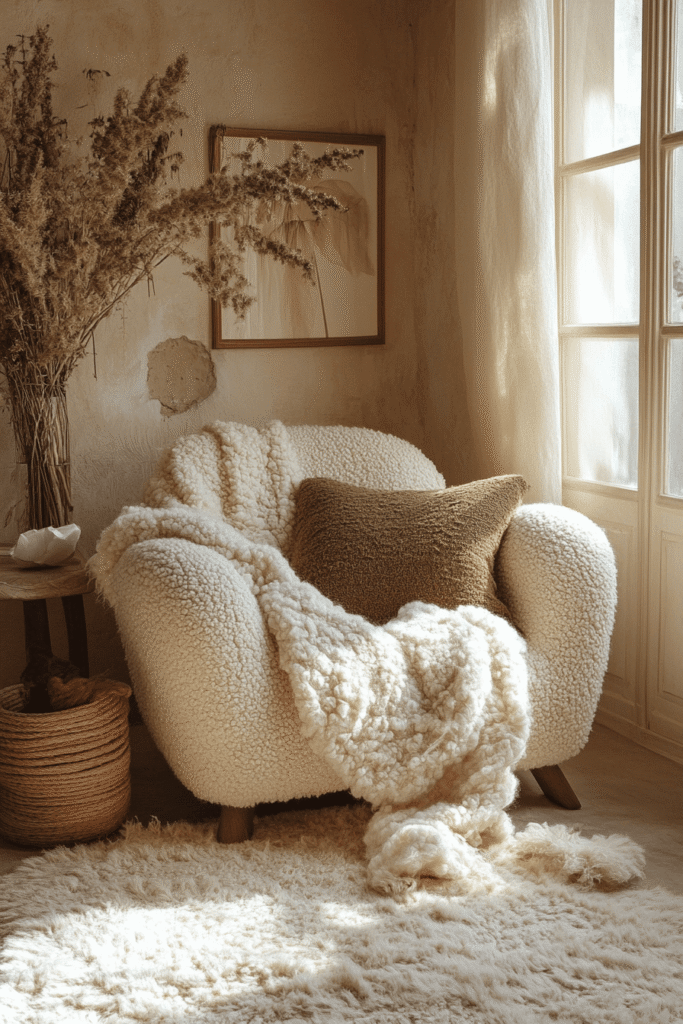 Layered textures and creamy shades create warmth in aesthetic home decor. Knitted fabrics and curved furniture add softness. The limited color palette keeps everything cohesive. Warm light enhances the cozy feeling.