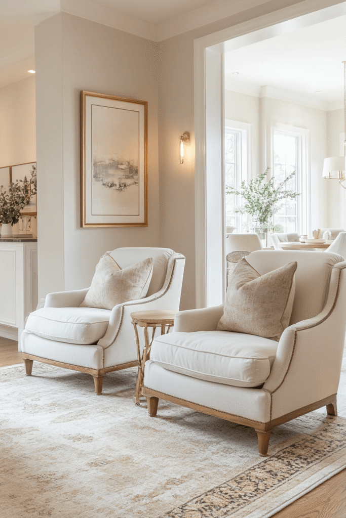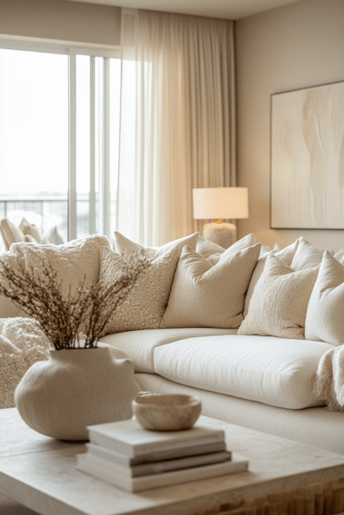 Soft creamy tones shape inviting corners that reflect aesthetic home decor with a cozy touch. Light colors and gentle furniture forms encourage rest and comfort. Simple furniture lines keep the look refined and uncluttered. Warm lighting deepens the creamy shades and enhances comfort.