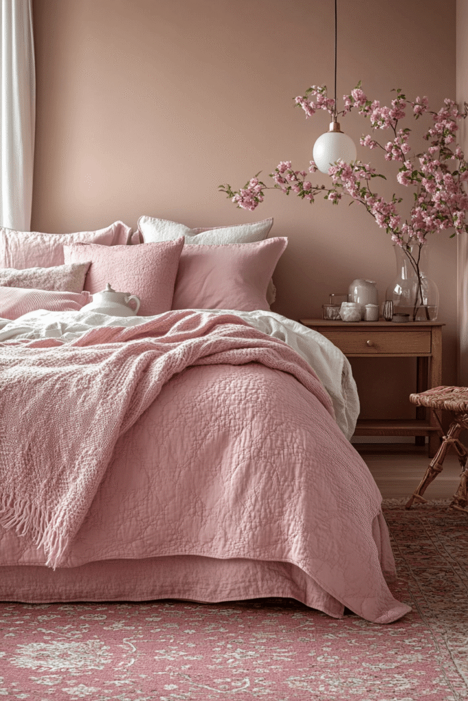 Rosy tones mixed with neutrals bring warmth to aesthetic home decor. Light furniture keeps the space open. Small metallic touches add polish. The overall feel is calm and elegant.