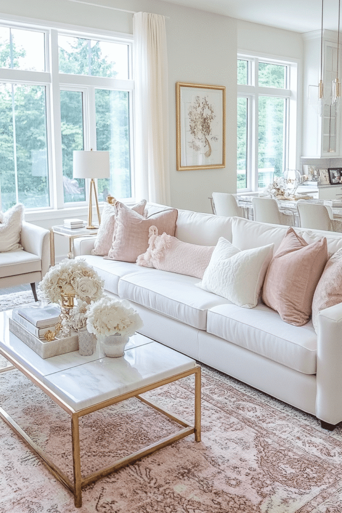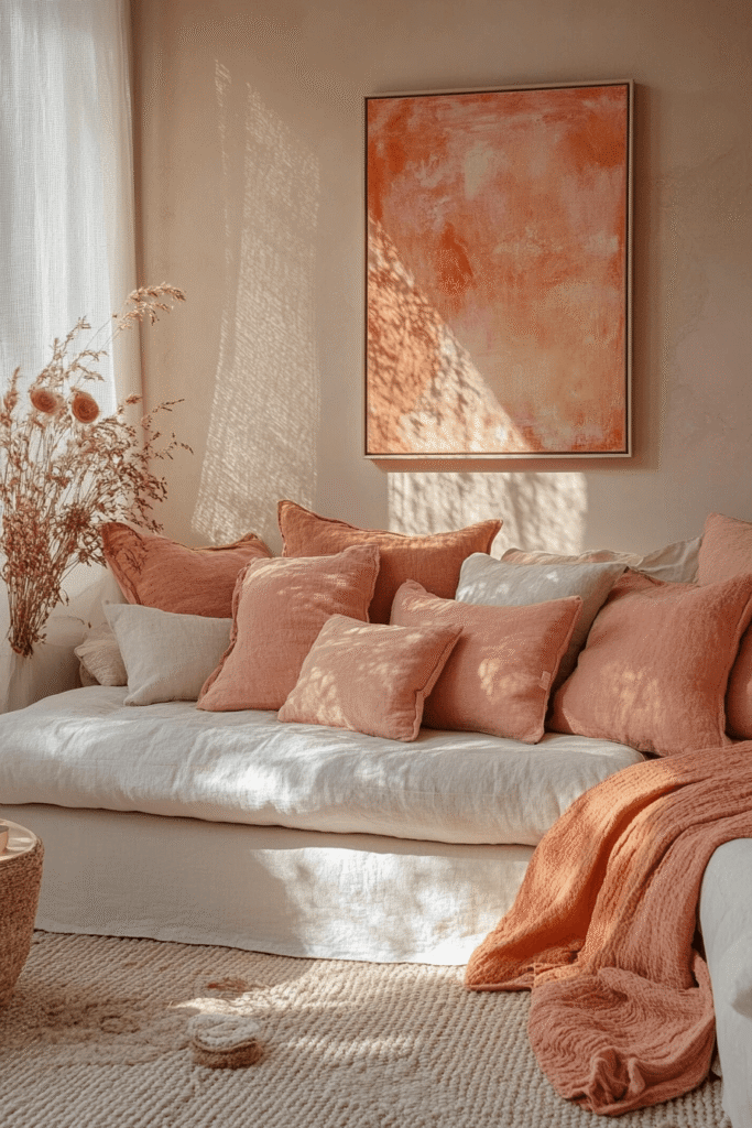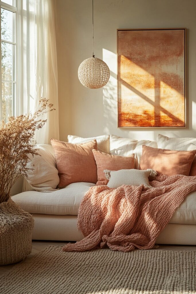 Blush tones paired with neutrals add softness and balance to aesthetic home decor. The color appears subtly through decor and textiles. Neutral furniture keeps the look grounded. The result feels calm, gentle, and welcoming.
