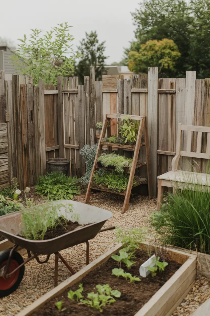 A rustic garden using reclaimed wood, metal, or stone adds charm and sustainability. Old ladders, crates, and vintage wheelbarrows can serve as planters or stands. Pairing these with wildflowers or hardy plants creates a natural, eco-friendly outdoor space with character.