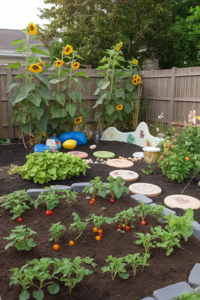 Encourage children to enjoy gardening with a space designed for them. Small vegetable patches with cherry tomatoes, carrots, or strawberries, along with sunflowers and playful features, create an interactive and creative environment that fosters a love for nature.