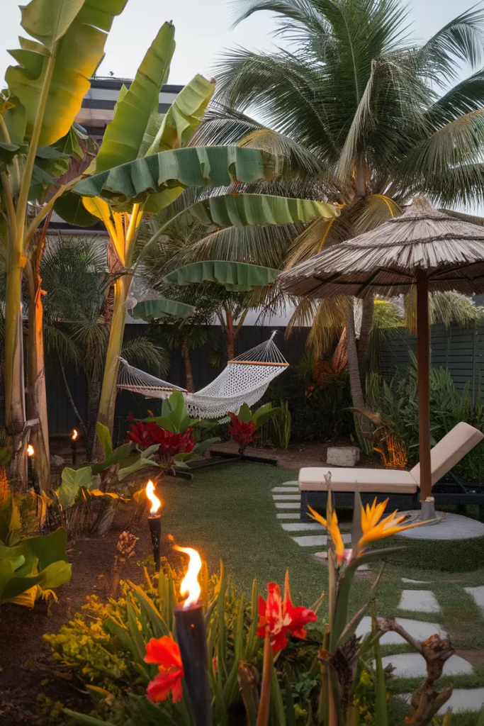 Bring a tropical feel to your backyard with banana plants, palms, hibiscus, and bird-of-paradise. Tiki torches, bamboo decor, or a thatched umbrella can enhance the exotic vibe. Adding a hammock or lounge chair completes the getaway atmosphere for ultimate relaxation.