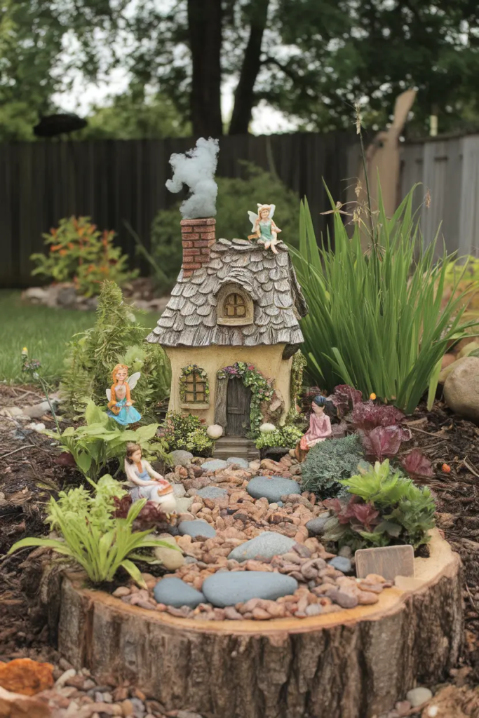 A fairy garden adds a whimsical touch with miniature plants, pathways, and decorative elements. Moss, tiny ferns, and succulents paired with fairy figurines and miniature cottages create a magical environment. Repurposed items like old pots or wheelbarrows can serve as creative focal points.
