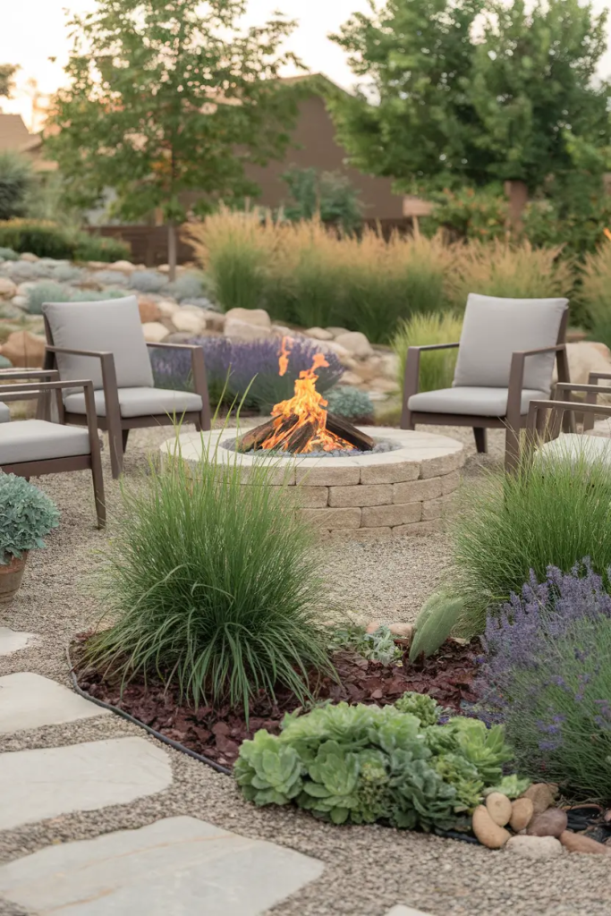 A fire pit surrounded by plants creates a warm, inviting outdoor area. Use ornamental grasses, succulents, or lavender to frame the space, and incorporate stone or brick accents for cohesion. Comfortable chairs or benches make it a perfect spot for evenings with friends and family.