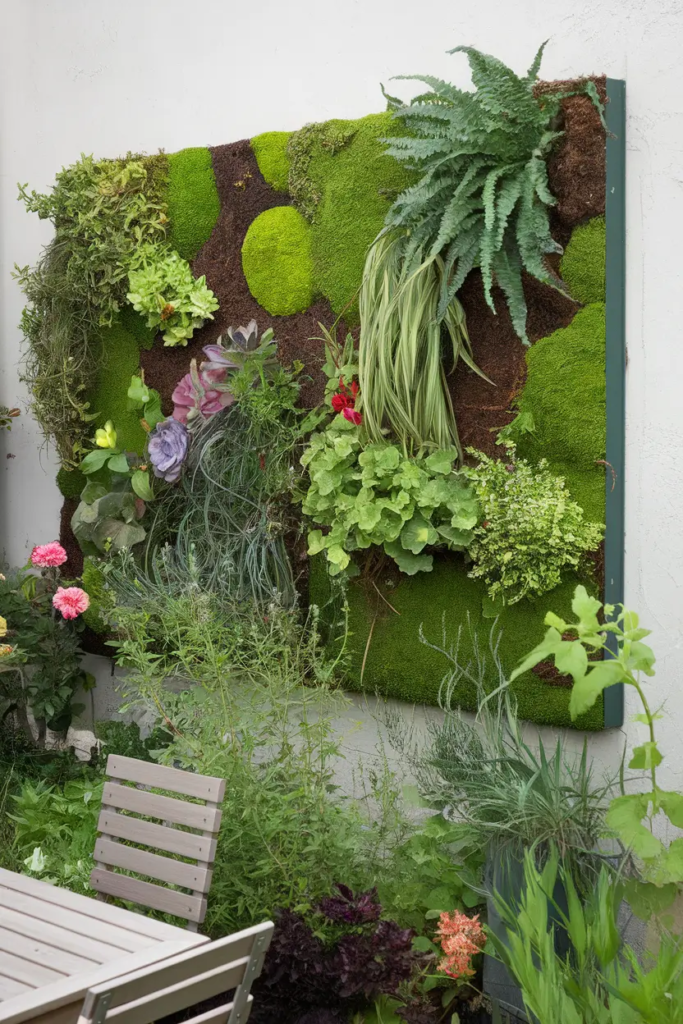 Living walls turn fences or blank walls into lush, green backdrops. Ferns, moss, ivy, herbs, or succulents add texture and color while improving air quality and insulation. A vertical garden like this enhances the aesthetic and functionality of your outdoor space.