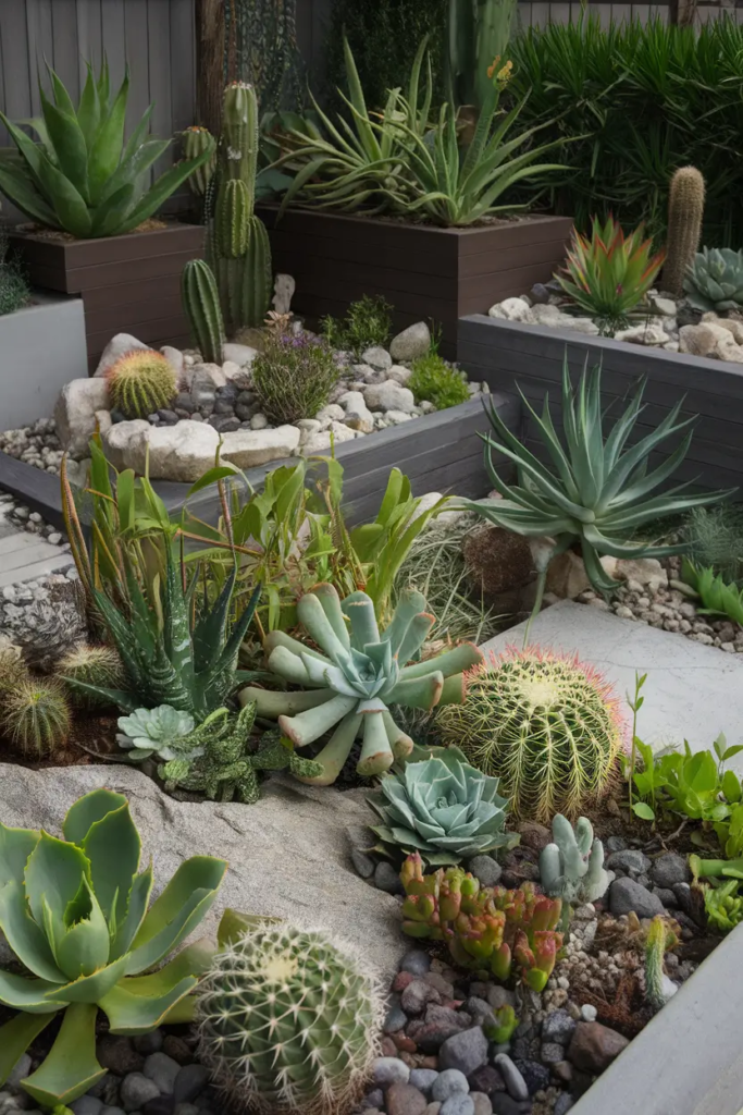 Succulent gardens offer low-maintenance options for dry climates. Aloe, agave, echeveria, and cacti provide varied shapes, colors, and textures. Arrangements in planters or rock beds create striking visuals with minimal watering, perfect for a modern, drought-resistant backyard.