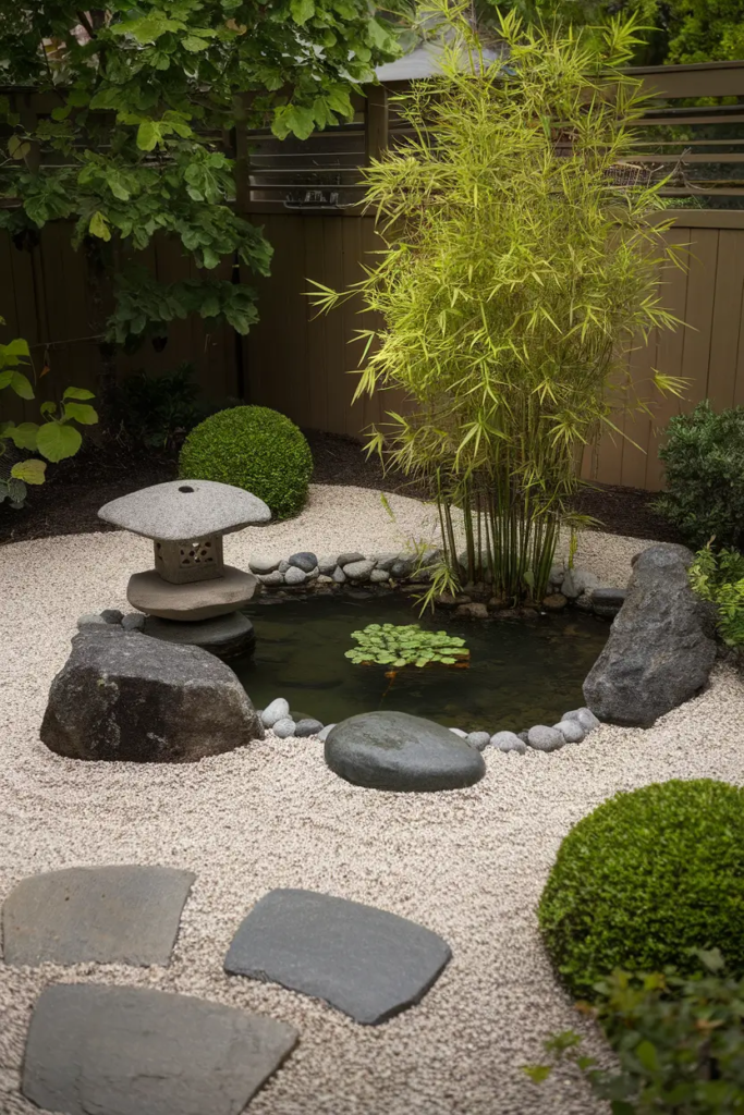 A Zen garden promotes simplicity and mindfulness with elements like sand, rocks, and carefully pruned plants. Patterns in gravel or sand create a meditative space, while bamboo fountains, stone lanterns, and bonsai trees enhance the calming ambiance. It’s ideal for relaxation and reflection.