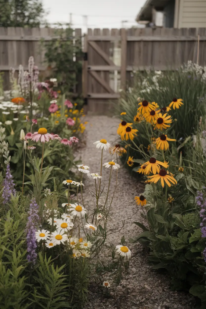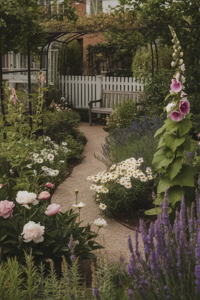 A cottage-style garden captures rustic charm with a mix of colorful perennials and fragrant blooms. Flowers like peonies, daisies, lavender, and hollyhocks create a nostalgic feel. Gravel or brick pathways and garden accessories like arbors or benches enhance the cozy, inviting atmosphere.