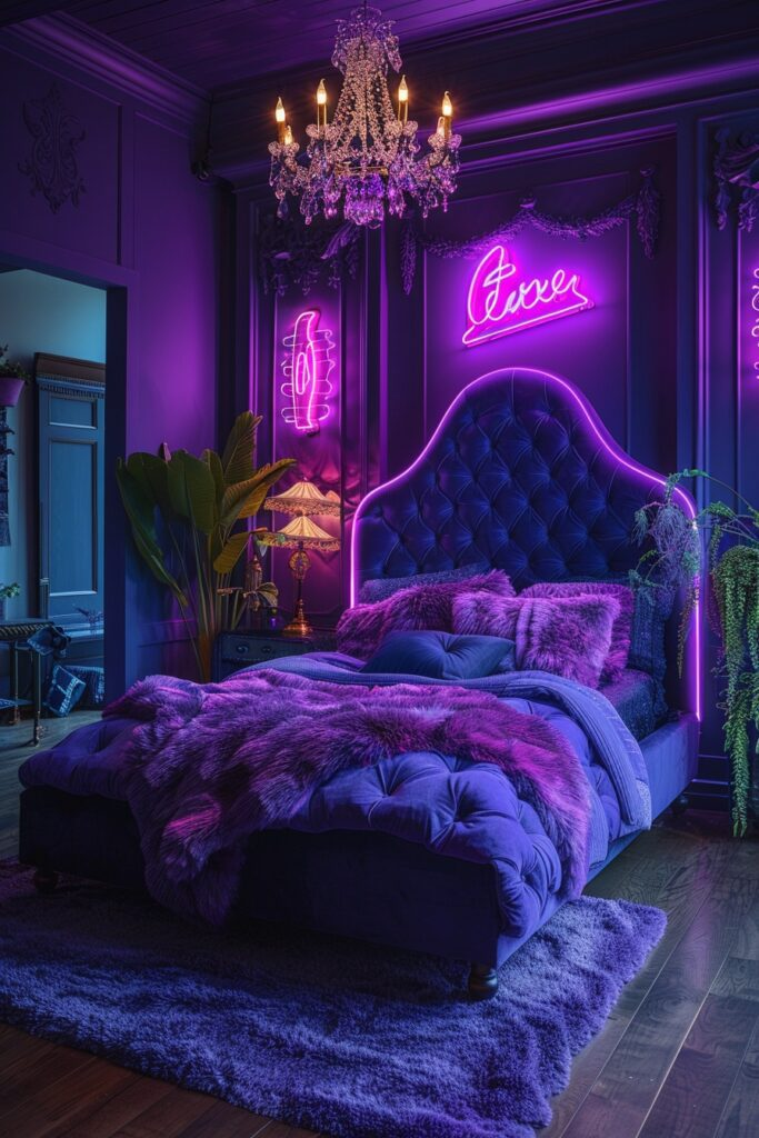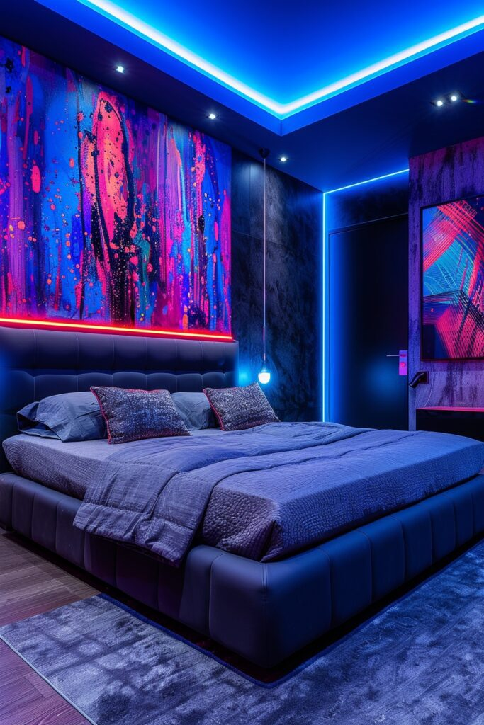 Bold decor defines this bedroom. Neon lights highlight the room’s strong design. Dark tones add depth and elegance. The space feels confident and stylish. This is a strong and fearless bedroom style.