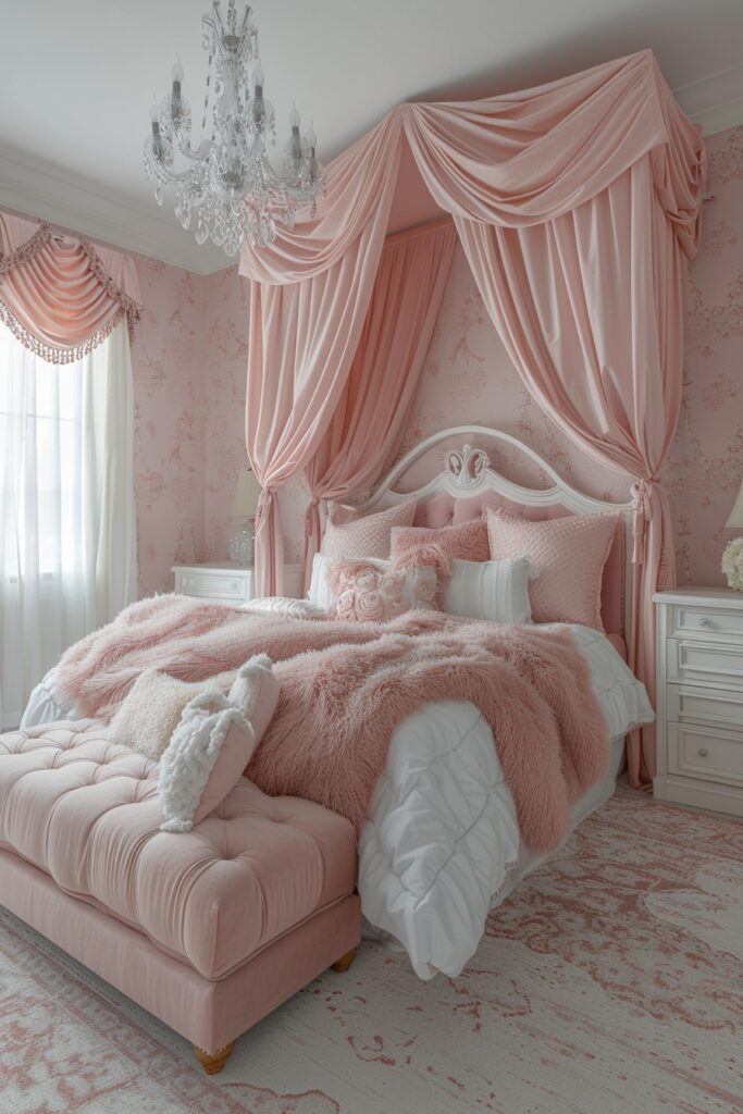 This bedroom uses soft pink shades to create a warm and welcoming feel. Plush fabrics and layered bedding make the room feel cozy and comfortable. Light-colored furniture keeps the space calm, while decorative lighting adds a soft glow. Pink decor adds charm without being overwhelming. This baddie bedroom idea is perfect for someone who loves a mix of softness and luxury.