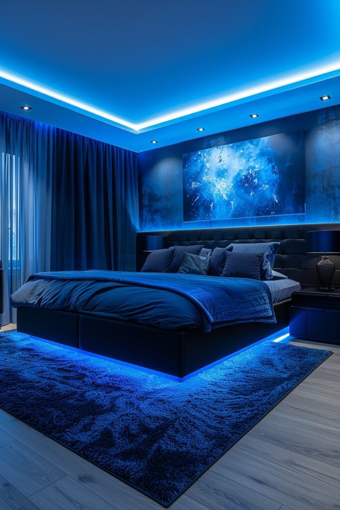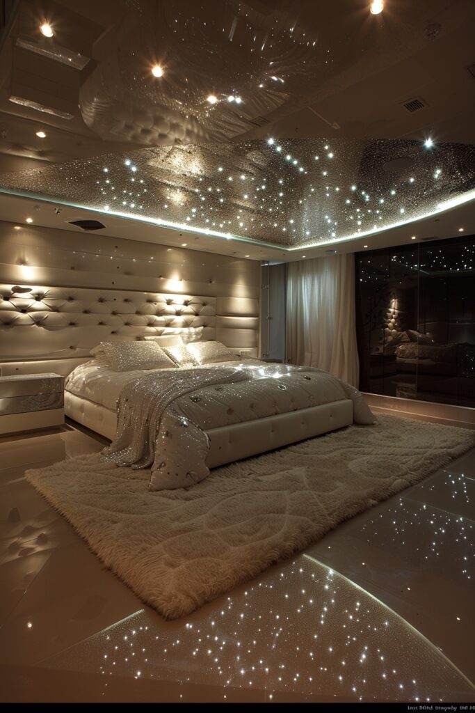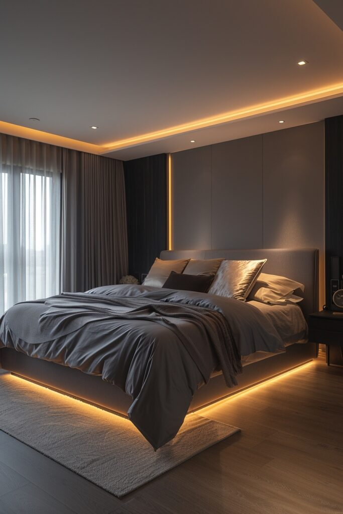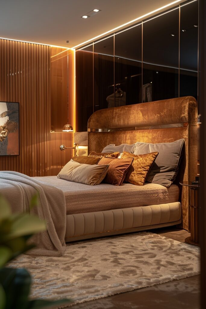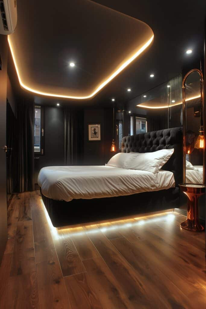 LED strip lighting adds glow and depth to this glamorous bedroom. Plush bedding and stylish furniture create comfort. Reflective surfaces enhance the lighting effect. The room feels luxurious but still cozy. It’s perfect for someone who enjoys modern glam.