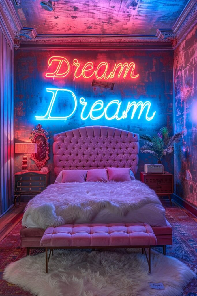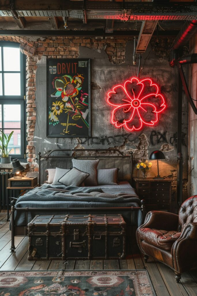 This room blends bold attitude with stylish decor. Neon signs bring personality and attitude to the space. Modern furniture keeps the look clean, while industrial details add edge. Soft rugs and lighting help balance the harder elements. This bedroom feels expressive and confident, making it ideal for someone who likes standing out.