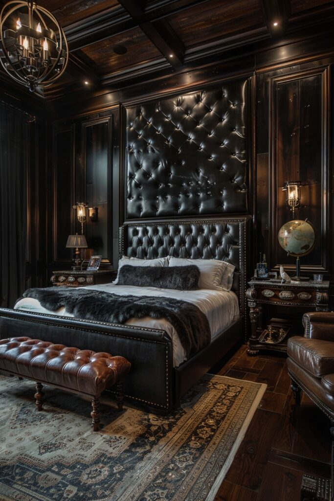 Leather furniture gives this bedroom a strong and confident look. The smooth texture adds richness, while elegant lighting softens the space. Metallic accents and plush fabrics add layers to the design. The lighting creates warmth, making the room feel inviting instead of heavy. This is a powerful baddie bedroom idea with a bold personality.