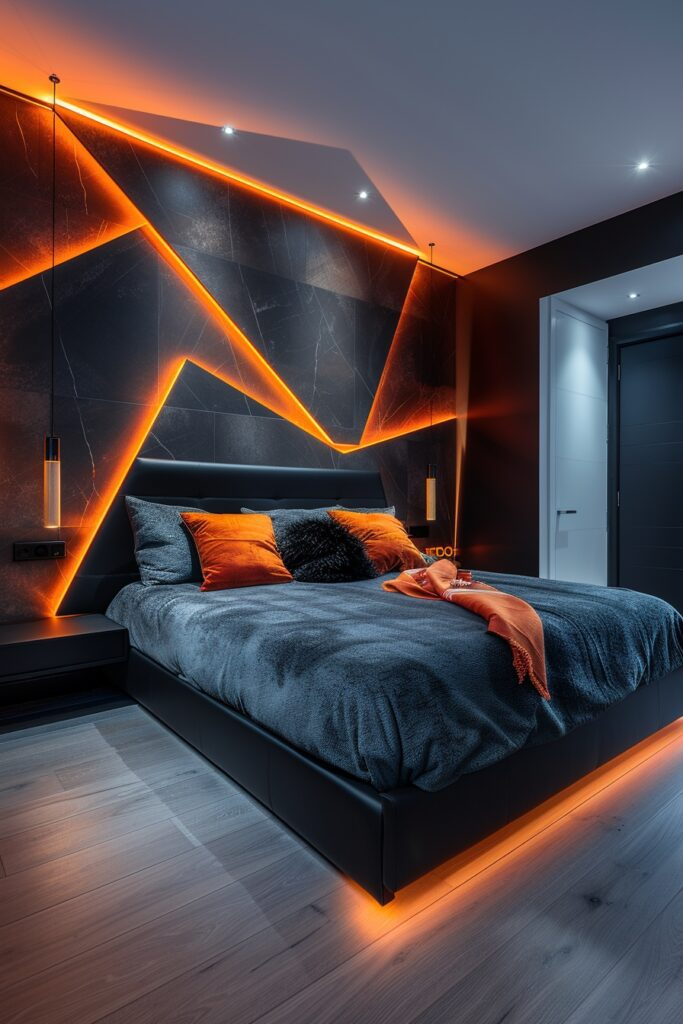 This bedroom focuses on bold lighting and expressive decor. Strong light features highlight the room’s design. Modern furniture and bold accessories show personality. The space feels energetic and confident. It’s perfect for someone who wants their bedroom to reflect their fearless style.