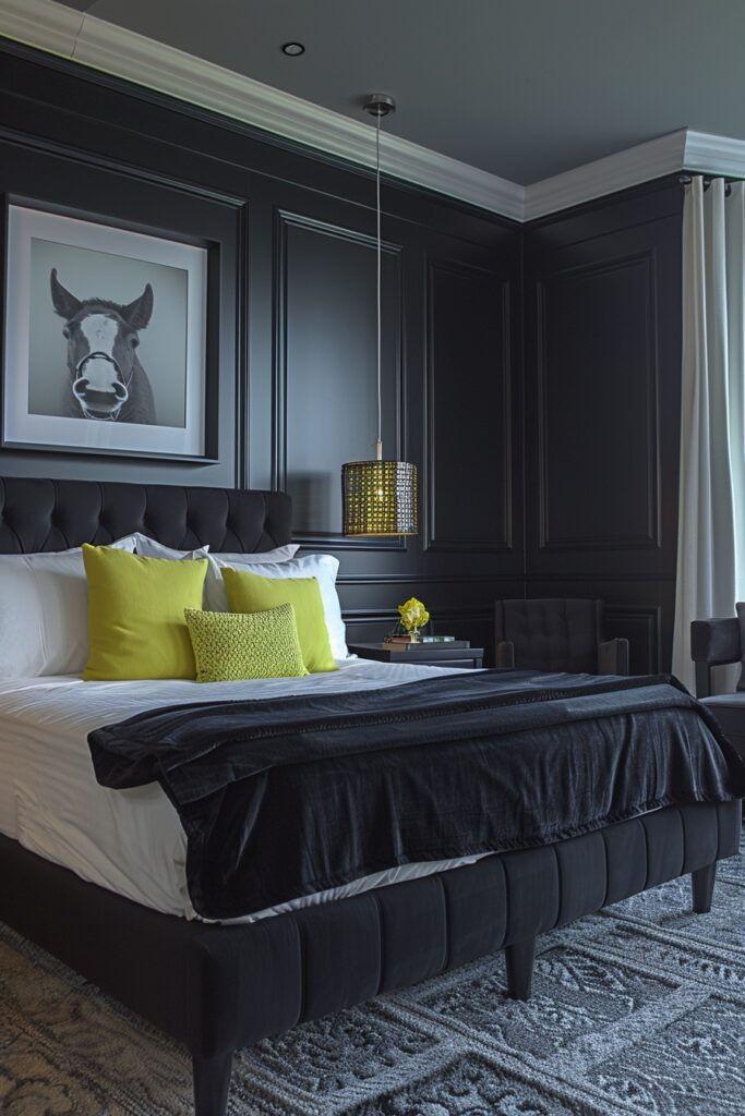Dark shades define this bedroom style. Black furniture and decor give the room a strong presence. Neon lighting adds brightness and highlights key areas. The contrast between dark and light makes the space feel dramatic and rich. This bedroom works well for bold personalities.