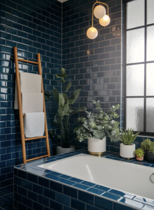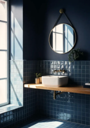 Using navy or deep blue tiles on the walls while keeping sinks, tubs, and other fixtures white creates a strong visual contrast. This balance allows the darker tones to stand out while the white elements keep the space feeling bright and fresh.