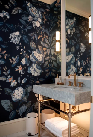 Wallpaper is a simple way to introduce pattern and visual interest into a bathroom. Blue wallpaper with floral, botanical, or abstract designs can instantly set the mood of the space.