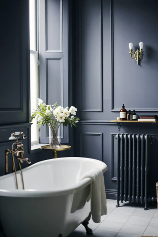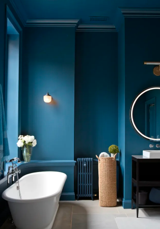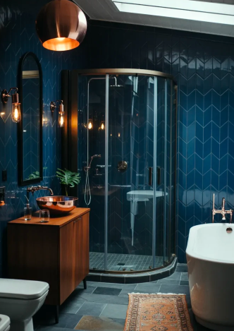 Blue has always been associated with elegance and timeless design. Rich shades like navy, indigo, and deep teal can instantly change the atmosphere of a bathroom. These darker tones create a dramatic effect while still feeling soothing and comfortable. Depending on how they are styled, they can make a space look luxurious, cozy, or even slightly playful.