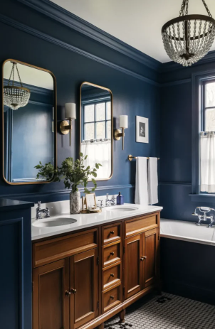Light oak vanities, walnut shelves, or rustic wooden elements add texture and balance to deep blue walls. This mix creates a design that feels both modern and slightly organic, making the bathroom appear more comfortable and lived-in.