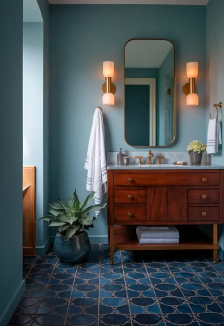 Some people prefer fully saturated blue walls, while others may only add small accents through tiles, floors, or accessories. Both approaches can work beautifully depending on the size and style of the bathroom.
