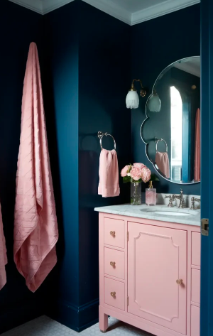 Using navy as the primary color for walls, cabinetry, or tiles creates a strong foundation for the design. Pink can then be added through smaller accents such as towels, mirrors, or decorative items.