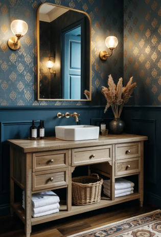 For those wanting a decorative touch, patterned wallpaper stands out among stylish Moody Blue Bathroom Ideas.