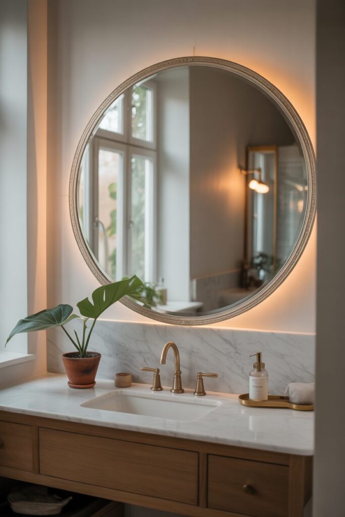 Round mirrors are one of my favorite choices when I want to soften the overall design. Bathrooms often have straight lines, and adding a circular mirror balances everything out.