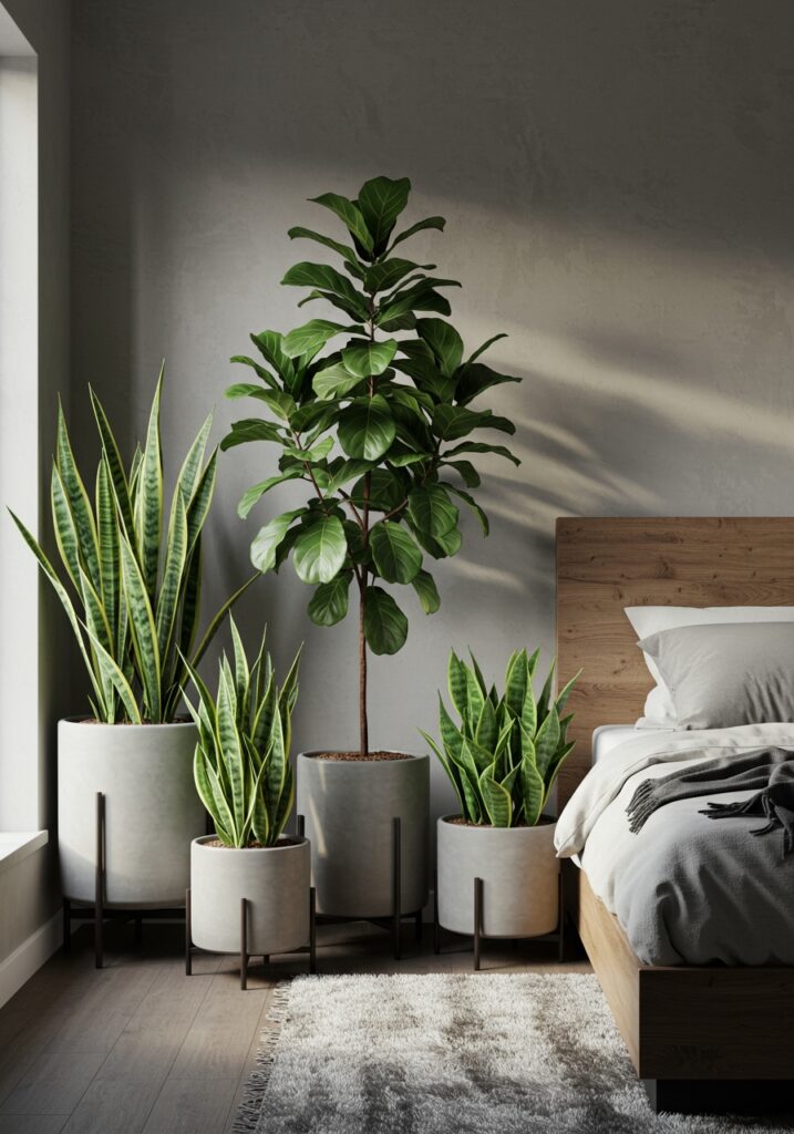 Adding natural touches makes the bedroom feel balanced and refreshed. Plants are an easy way to introduce life into the room without overcomplicating the design. Low-maintenance greenery works best, especially if you prefer minimal upkeep. Pair plants with simple pots in ceramic, metal, or stone finishes to keep the look aligned with masculine styling. Natural wood or stone accents also add texture and warmth, helping the room feel welcoming instead of sterile.