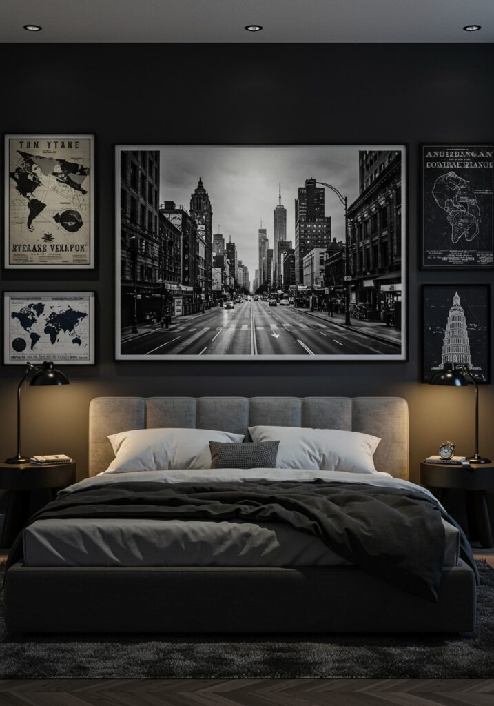 Empty walls can make a room feel unfinished. Adding carefully chosen artwork allows you to show your interests while strengthening the design. Black and white photography, abstract pieces, or vintage-style prints work well in masculine spaces. Larger pieces can act as a focal point, while a small collection arranged neatly can create visual interest. The key is to keep it meaningful and not overcrowded. Thoughtful wall art adds identity and keeps the room from feeling generic.
