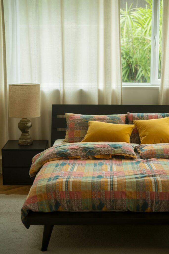 Patterned bedding softens the boldness of black furniture while introducing visual interest. Geometric designs, stripes, or florals can create a cozy, layered look. Keeping the furniture simple ensures that the room doesn’t feel visually cluttered while still expressing personality.