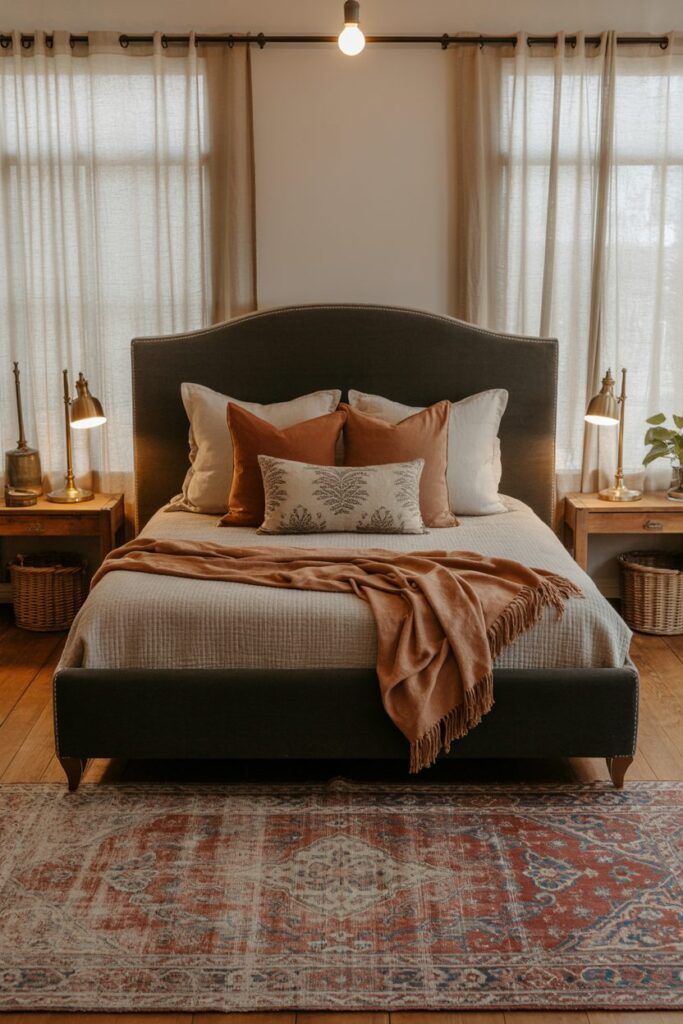 Rustic elements like reclaimed wood, woven baskets, and vintage rugs pair beautifully with black furniture. Combining black metal beds with wooden nightstands creates warmth, while antique decor and warm-toned textiles add charm and character, balancing contemporary sleekness with cozy farmhouse vibes.