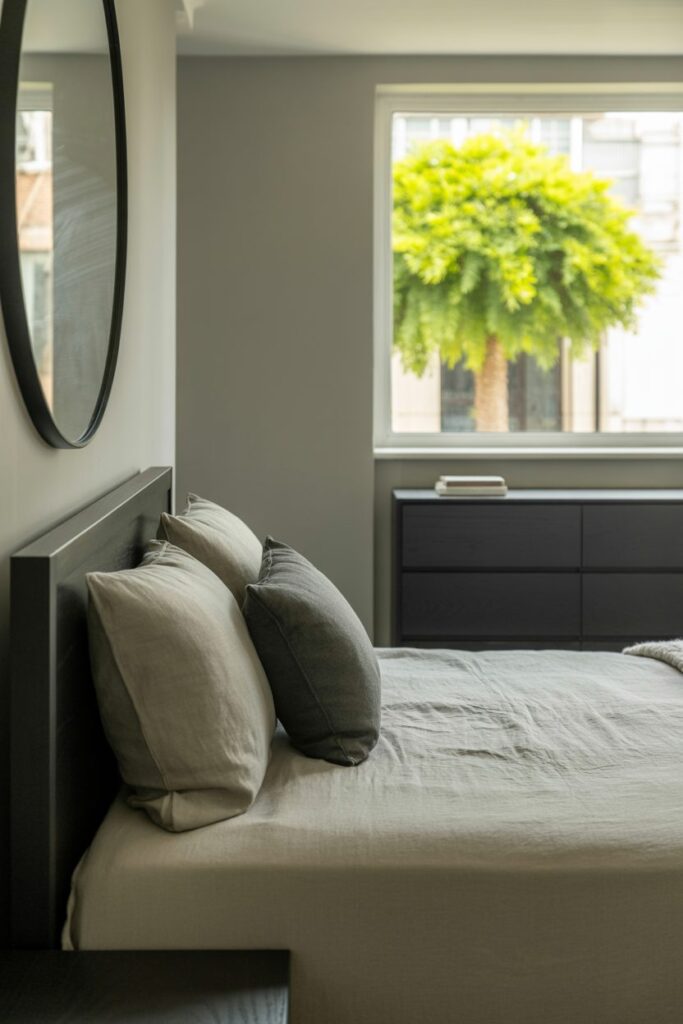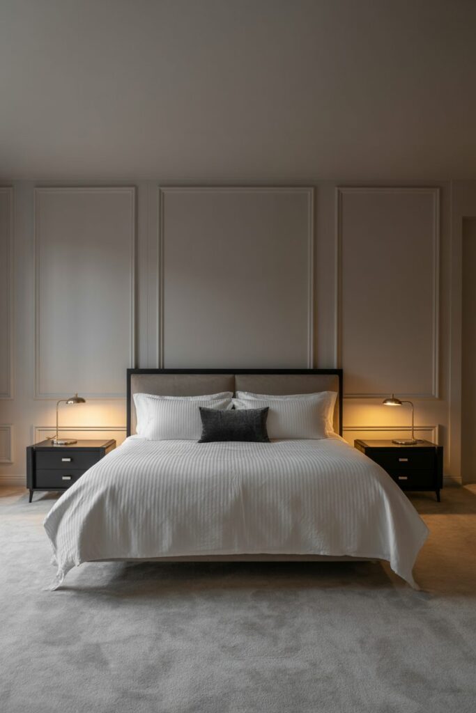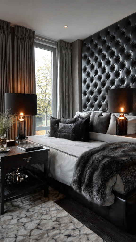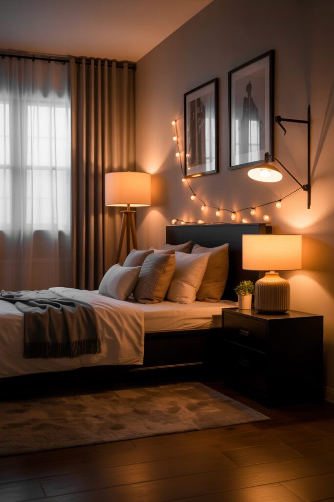 Proper lighting is key when styling a bedroom with black furniture. Layered lighting from floor lamps, table lamps, and string lights adds depth and keeps the space from feeling too heavy. Warm light bulbs soften black surfaces, and dimmable options allow for mood adjustments, ensuring the room remains cozy and inviting throughout the day and night.