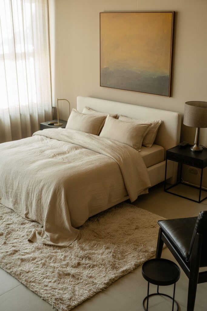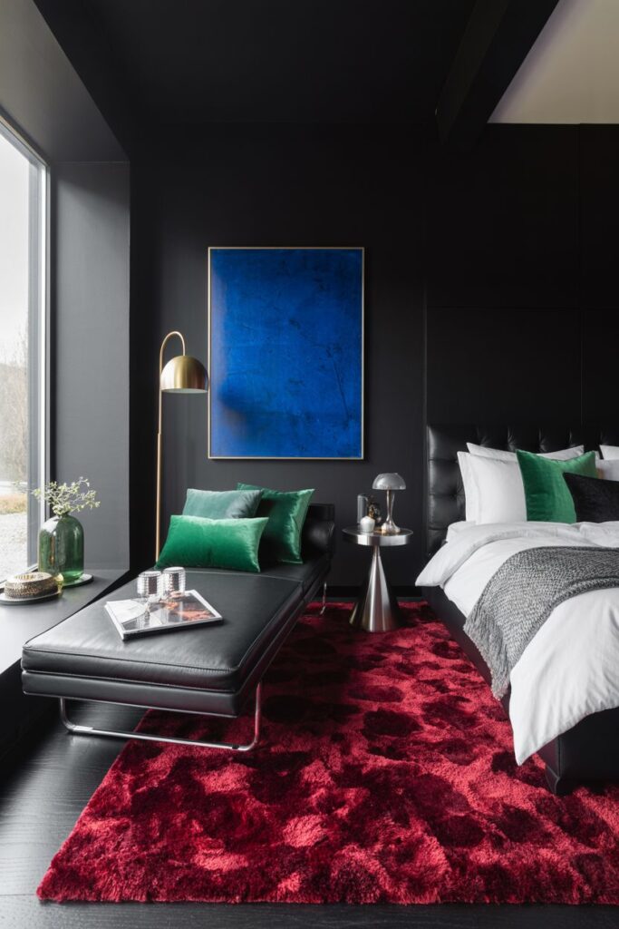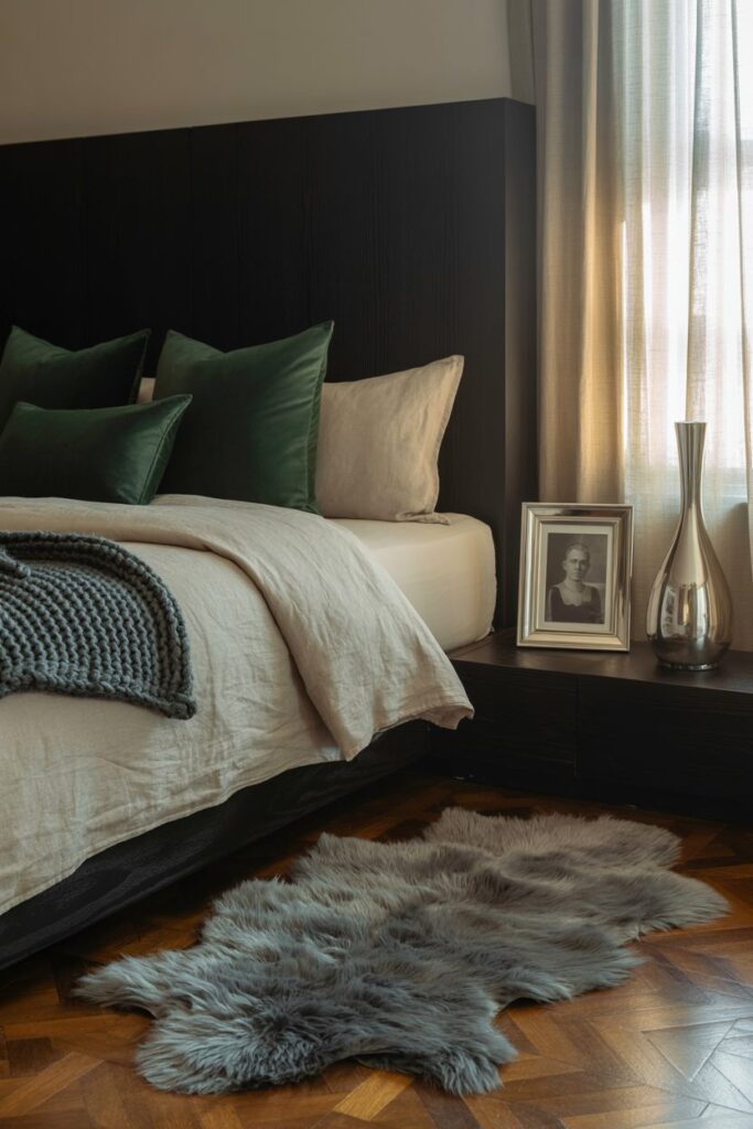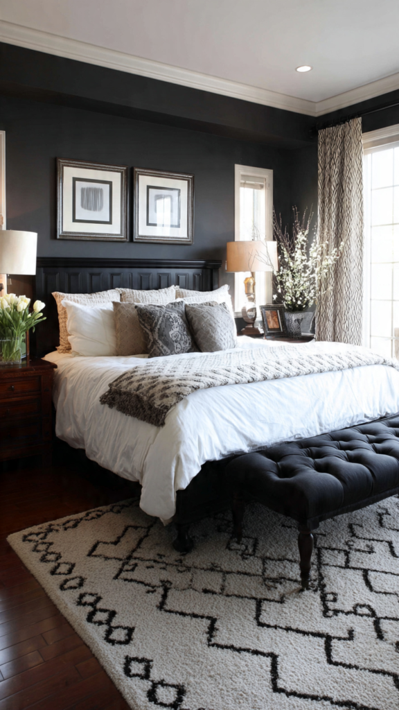 Soft rugs counterbalance the starkness of black furniture and add comfort. Shaggy, woven, or textured rugs work well in neutral or bold tones, helping to define spaces such as under the bed or in seating areas, while providing a cozy and welcoming feel.