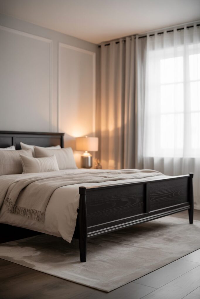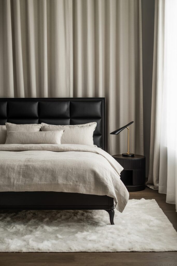 Layered curtains in sheer and blackout panels enhance bedrooms with black furniture. Light fabrics soften the space, while black curtain rods echo the furniture for cohesion. Layering adds depth and allows control over natural light, maintaining both function and style.