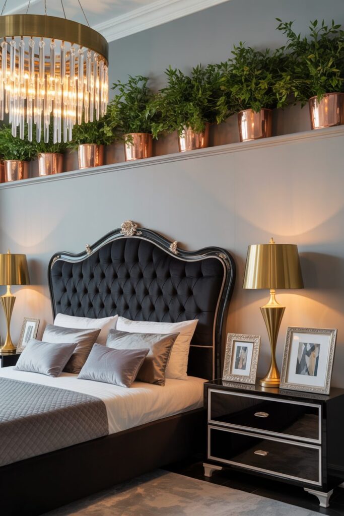Adding metallic touches enhances the luxury of black furniture. Gold bedside lamps, silver picture frames, or copper planters bring richness to the room. Statement light fixtures such as chandeliers or pendant lights draw attention, while metallic hardware on dressers and nightstands elevates black furniture with subtle sophistication.