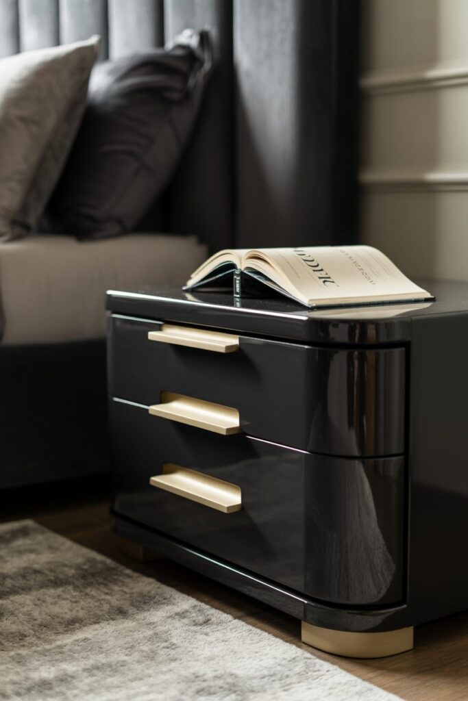 Matching black nightstands on either side of a bed create symmetry and functionality. Add coordinating lamps or decorative trays to enhance cohesion. Open shelving options allow for storage of books or essentials, keeping surfaces neat and maintaining a polished, streamlined aesthetic.