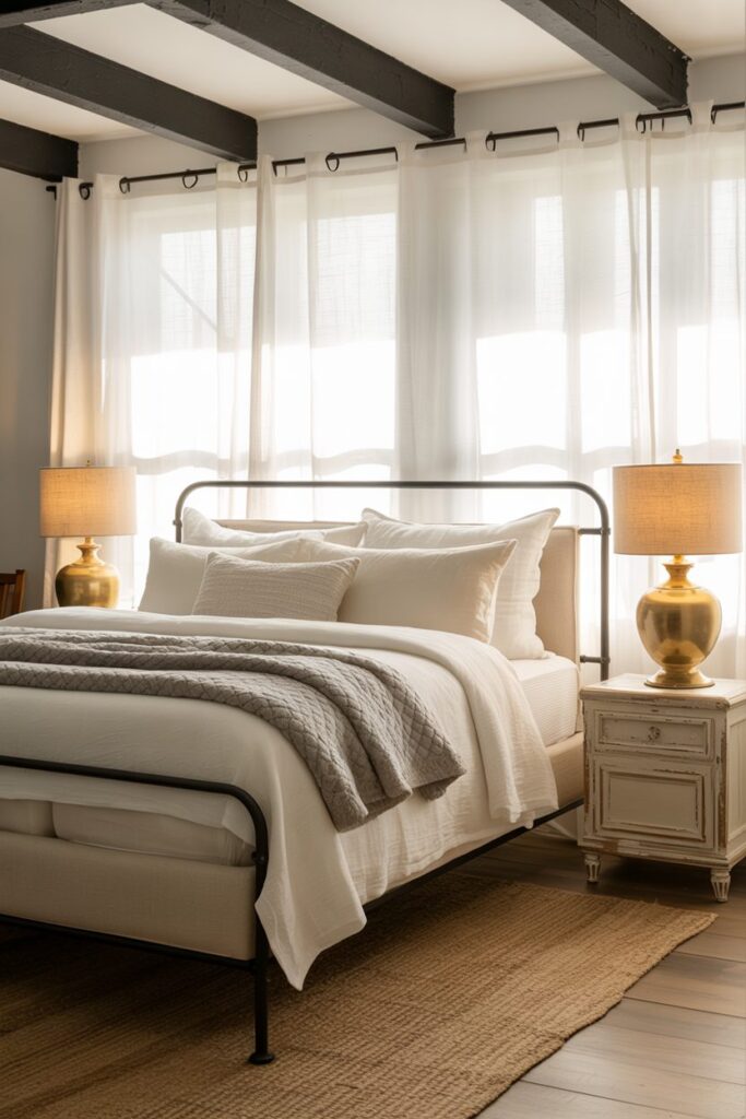 Modern farmhouse bedrooms pair black furniture with rustic accents like shiplap walls, distressed wood, and soft throws. Black bed frames and dressers combine with white bedding and vintage lighting to create a balanced blend of modern sophistication and cozy farmhouse charm.