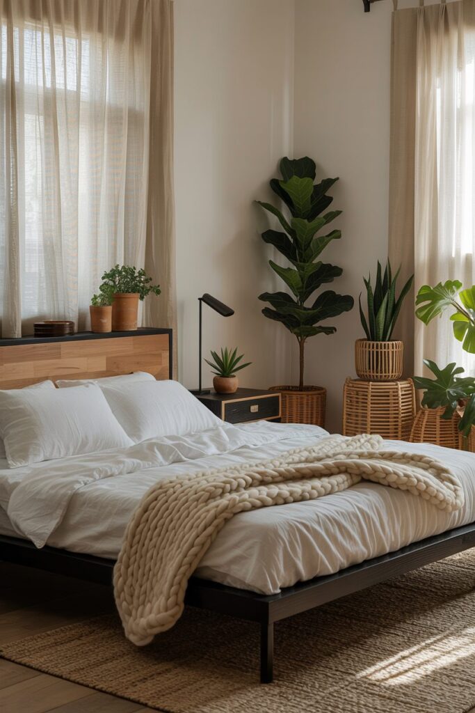 Natural elements bring life to a bedroom with black furniture. Wooden furniture pieces paired with black accents add warmth and texture, while plants introduce a fresh, calming vibe. Incorporating bamboo or rattan baskets can further soften the look and maintain balance, making black furniture feel approachable and harmonious within the room.