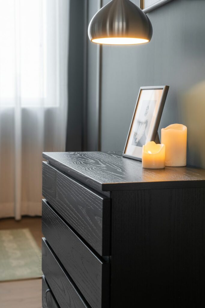 Black dressers not only offer storage but also anchor a bedroom’s design. Minimalist designs keep the look contemporary, while vintage-inspired pieces add character. Styling the top of dressers with a few decorative items like candles or framed photos maintains elegance without clutter, letting black furniture shine.