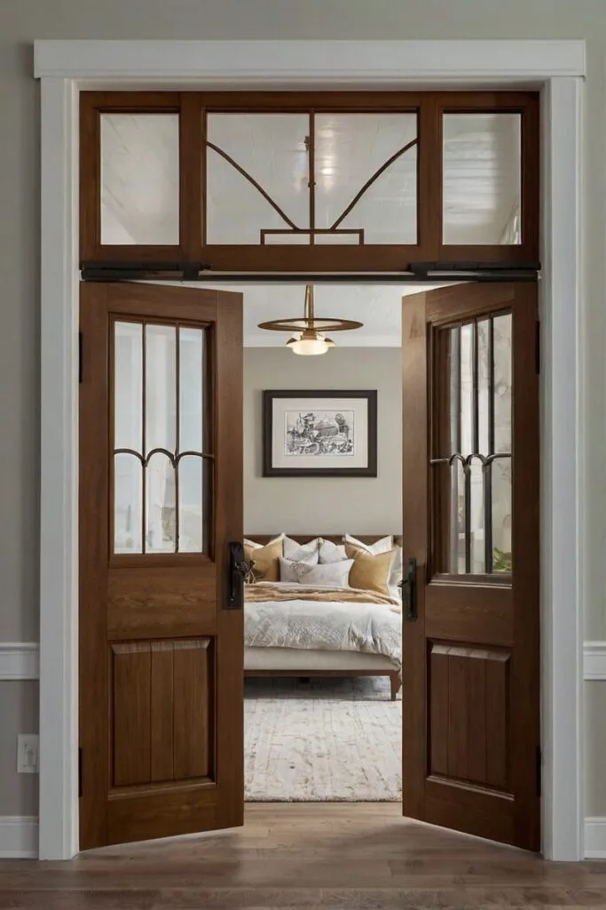 A statement arched door takes elegance to the next level. Its curved shape brings romance and old-world charm, creating a dramatic yet timeless focal point. Perfect for classic or Mediterranean-style bedrooms, these doors add sophistication and visual interest, making the entrance feel as special as the room itself.