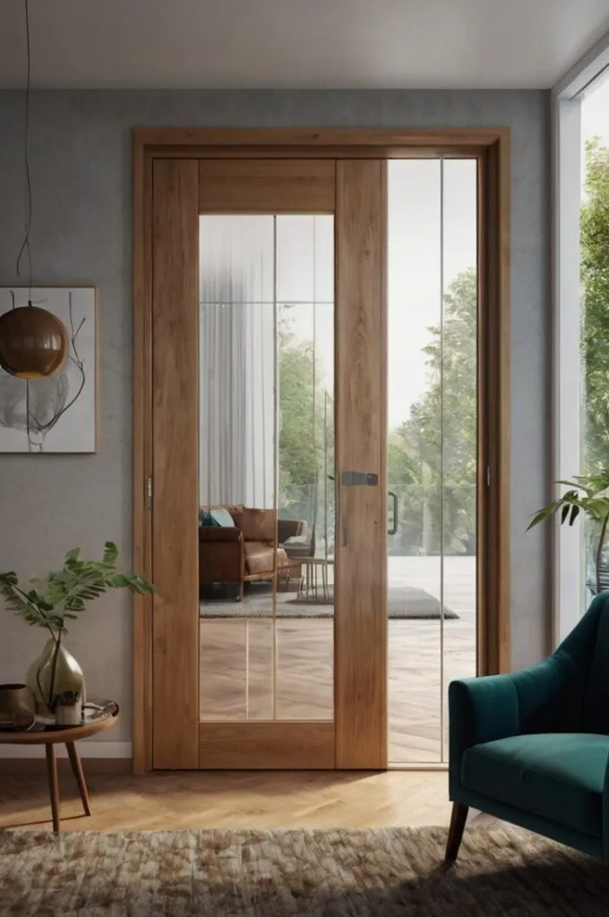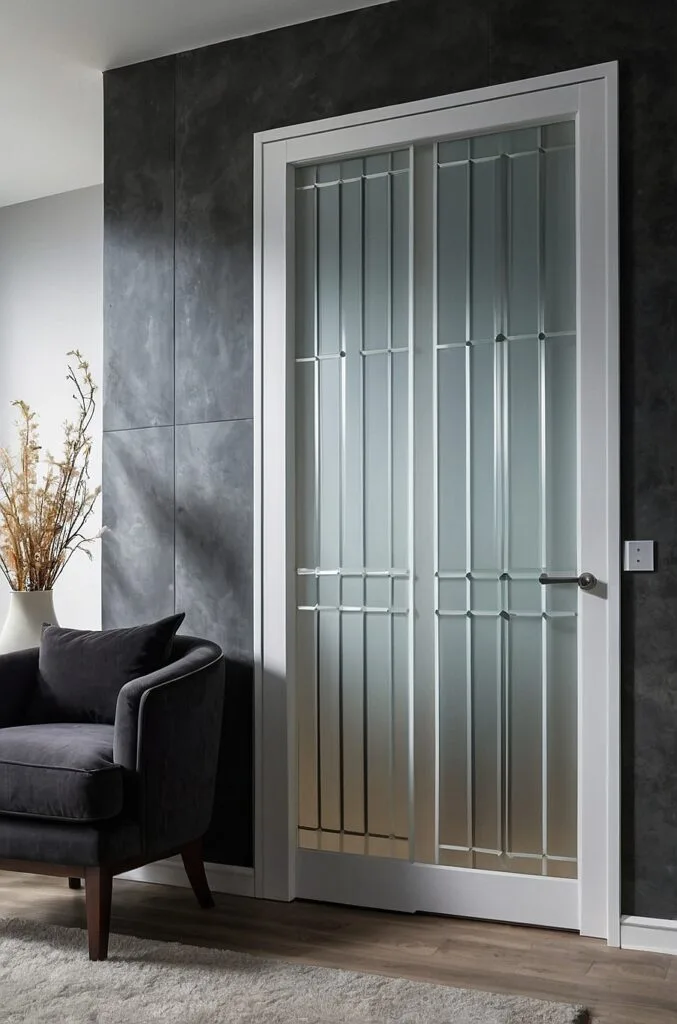 A frosted glass door adds sophistication and a hint of mystery. It allows natural light to filter into the bedroom while preserving privacy, making it a popular choice for modern and minimalist interiors. I’ve noticed that frosted glass doors bring a soft, serene glow to the room, enhancing the sense of calm without compromising style.