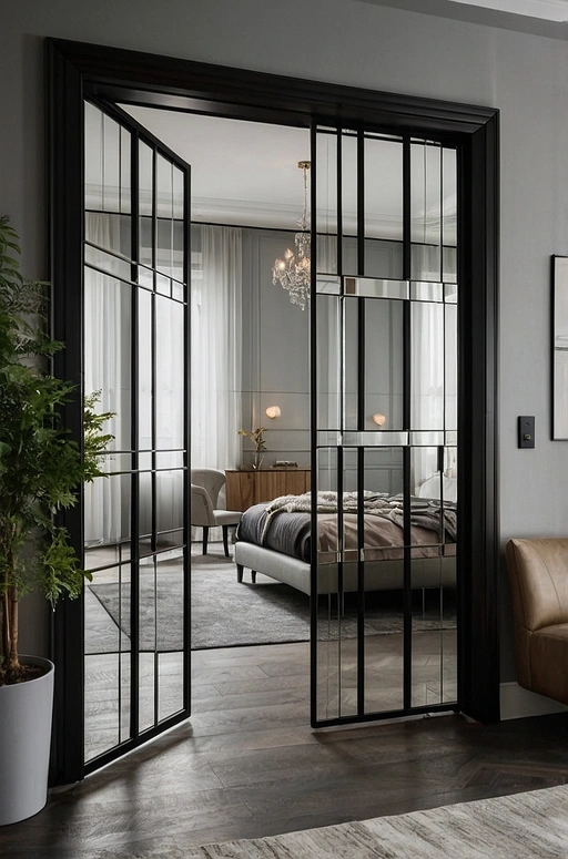For a bold, urban aesthetic, a metal-framed industrial door is an excellent choice. Often paired with glass panels, these doors combine durability with contemporary style. They suit lofts, modern apartments, or bedrooms that embrace architectural elements and edgy design. The contrast of metal and glass creates a striking statement while still maintaining functionality.